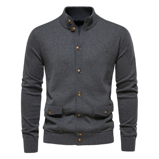 Men's Cotton Cable Knit Cardigan with Pockets, Stand Collar, Button-Down Sweater | CW61