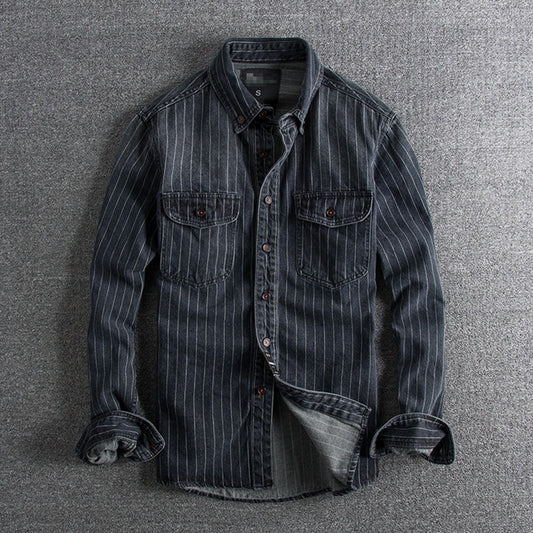 Men's Retro Heavy Distressed Denim Shirt Slim Fit Striped Long Sleeve Shirt | 8833