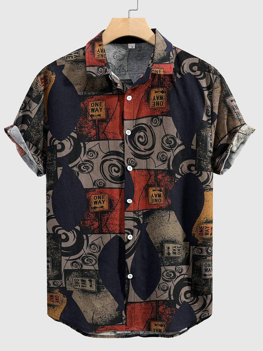 Men's Short Sleeve Button Up Top Lapel Collar Geometric Print Loose Fit Breathable Quick-Dry Cotton Blend Shirt