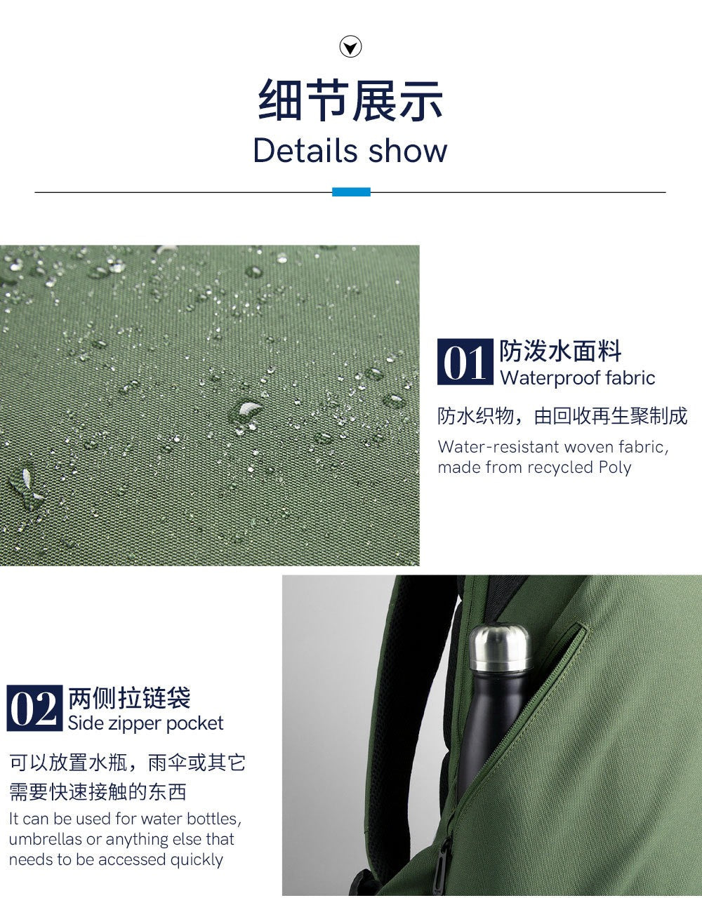 With a 16L capacity and multiple compartments, it fits a 15.6-inch laptop while keeping daily essentials neatly organized. The water-resistant recycled polyester ensures your belongings stay safe from light rain, while the built-in TSA lock and external USB charging port add extra convenience and security.