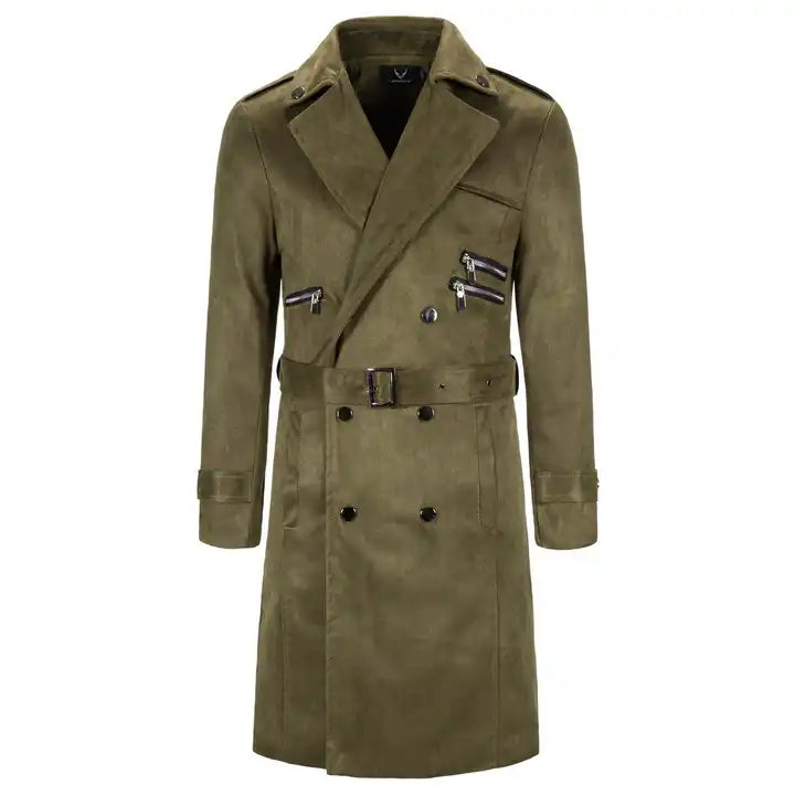This Men's Long Faux Suede Trench Coat is designed with a belted lapel, double-breasted closure, and an adjustable fit for ultimate comfort. A timeless style, perfect for the office or an evening out.
