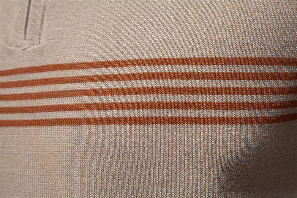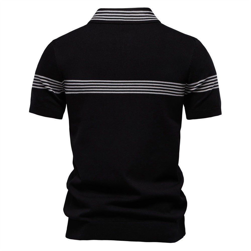 Elevate your professional wardrobe with our Men's Slim-Fit Stripe Knit Polo Shirt. Meticulously crafted with a tailored silhouette that flatters the masculine form, this 2025 summer essential seamlessly transitions from office meetings to evening gatherings. The breathable knit fabric provides exceptional comfort while maintaining a polished appearance throughout the day. Strategic stripe patterning creates a refined visual interest that complements both tailored trousers and casual chinos.