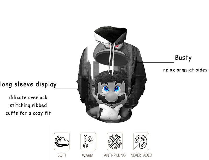 Stay warm and stylish this autumn with our Men's Super Mario Bros Printed Hoodie Pullover. Designed for the hip-hop enthusiast, this hoodie features a fun and playful Mario Bros print. Made with quality materials, this sweatshirt will be your go-to for comfort and fashion. Order now for a 10% discount!