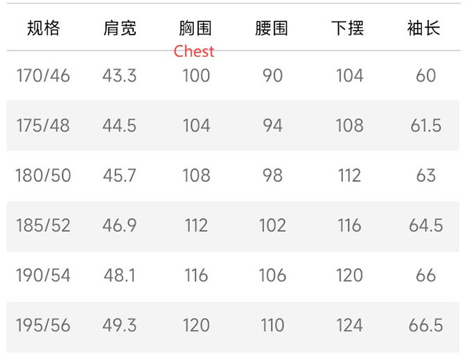 165/84A, 170/88A, 175/92A, 180/96A, 185/100A, 190/104A |