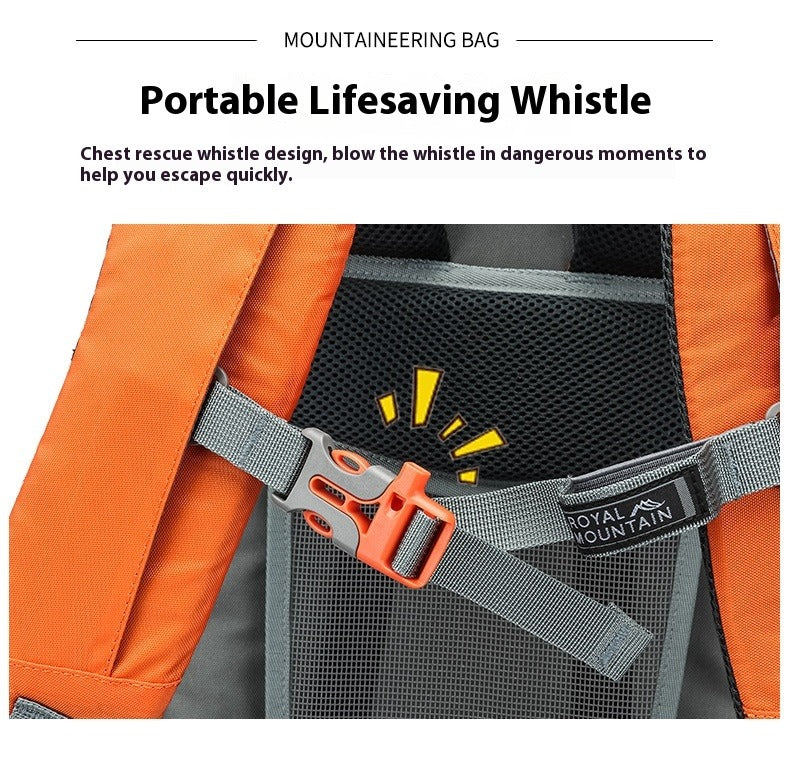 The backpack includes safety and convenience features such as a built-in chest whistle for emergencies, mountaineering pole loops, and hydration system compatibility with a water bladder fixed by Velcro inside and a tube routed through the shoulder strap D-ring for easy access.