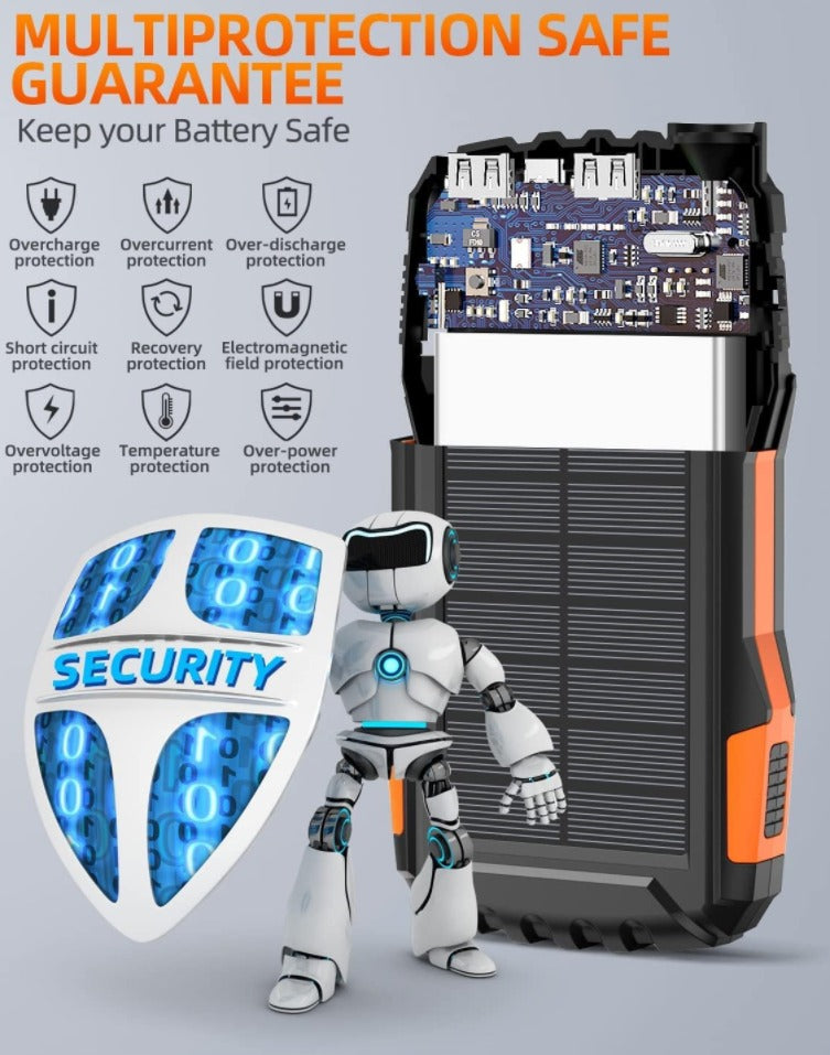 This Solar Power Bank boasts a 20000mAh capacity, making it perfect for charging all of your devices on the go. With its portable and compact design, you can easily take it with you wherever you go. Plus, its solar charging feature allows you to charge your devices even when you don't have access to an outlet. Stay powered up and connected with this reliable and efficient power bank.