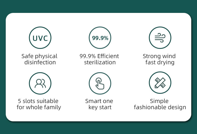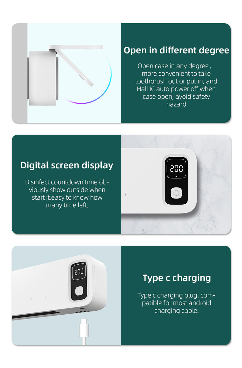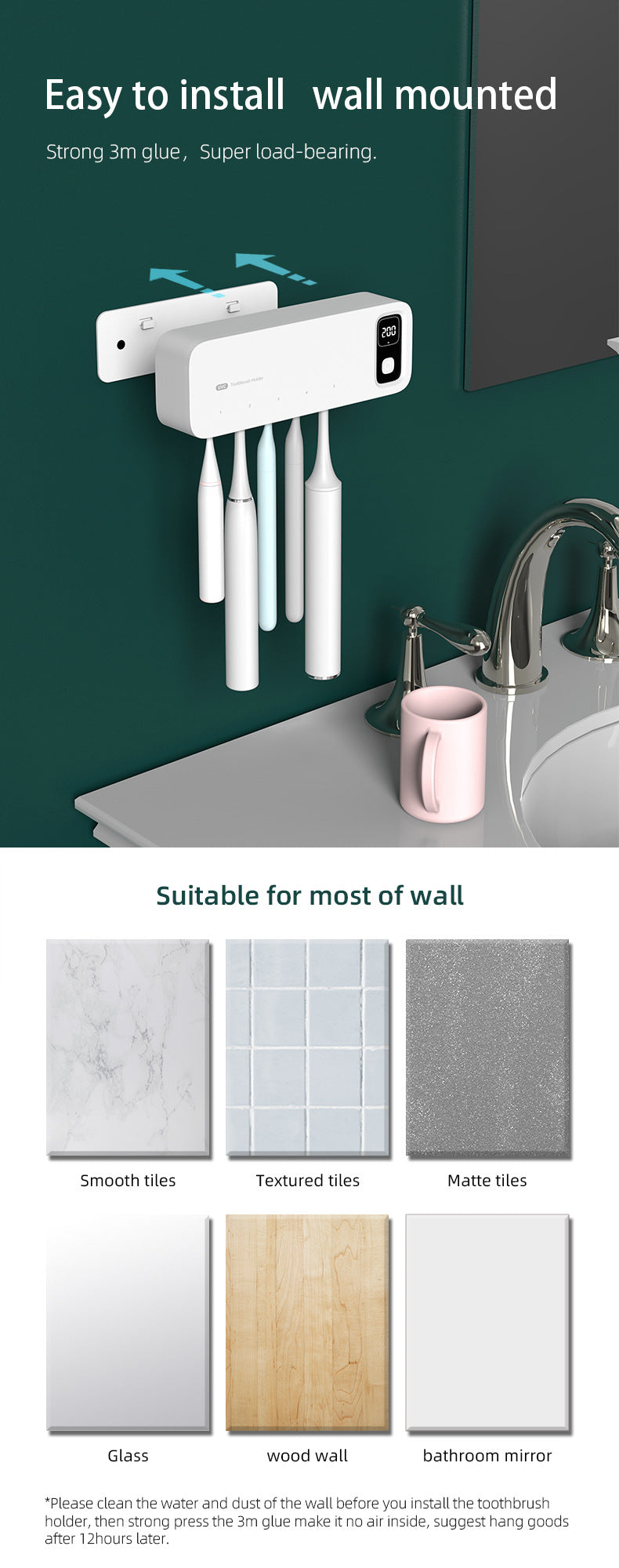 Keep your family's toothbrushes clean and germ-free with our UVC Toothbrush Sterilizer. Mount it on the wall for easy access and use, and charge it with the convenient USB charging feature. The built-in fan also ensures quick and efficient drying for your toothbrushes. Say goodbye to bacteria and hello to a healthier smile.